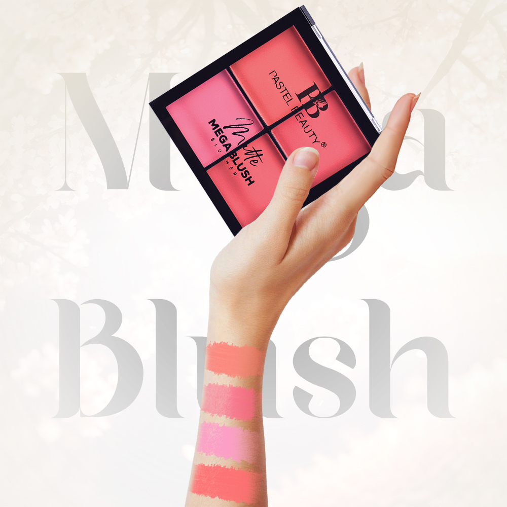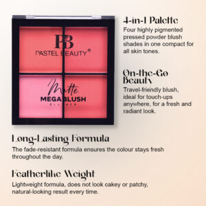 Achieve Radiant Perfection with PASTEL BEAUTY Mega Blush 4-in-1 Compact! Featuring four buildable, highly pigmented shades, this versatile palette lets you mix and match for a fresh, customizable glow. Its lightweight, pressed powder formula blends seamlessly for a flawless finish, while the 11.2g compact is perfect for touch-ups on the go. Elevate your makeup game with this must-have essential and create a look that’s uniquely yours! How to apply Achieve Radiant Perfection with PASTEL BEAUTY Mega Blush—sweep, blend, and glow for a fresh, all-day flush of color. Because your beauty deserves nothing less!Â- How to Apply: Sweep the blush onto the apples of your cheeks, blending upwards towards the cheekbones and temples for a naturally radiant look.
